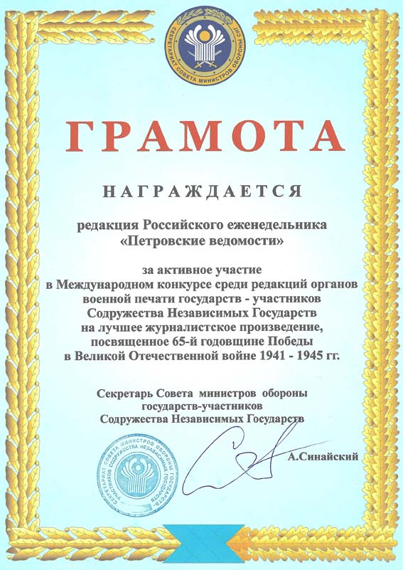 Газета "Петровские ведомости" получила почетную грамоту Совета министров обороны государств - участников Содружества Независимых Государств уза лучшее журналистское произведение, посвященное 65-ой годовщине Победы в Великой Отечественной войне.